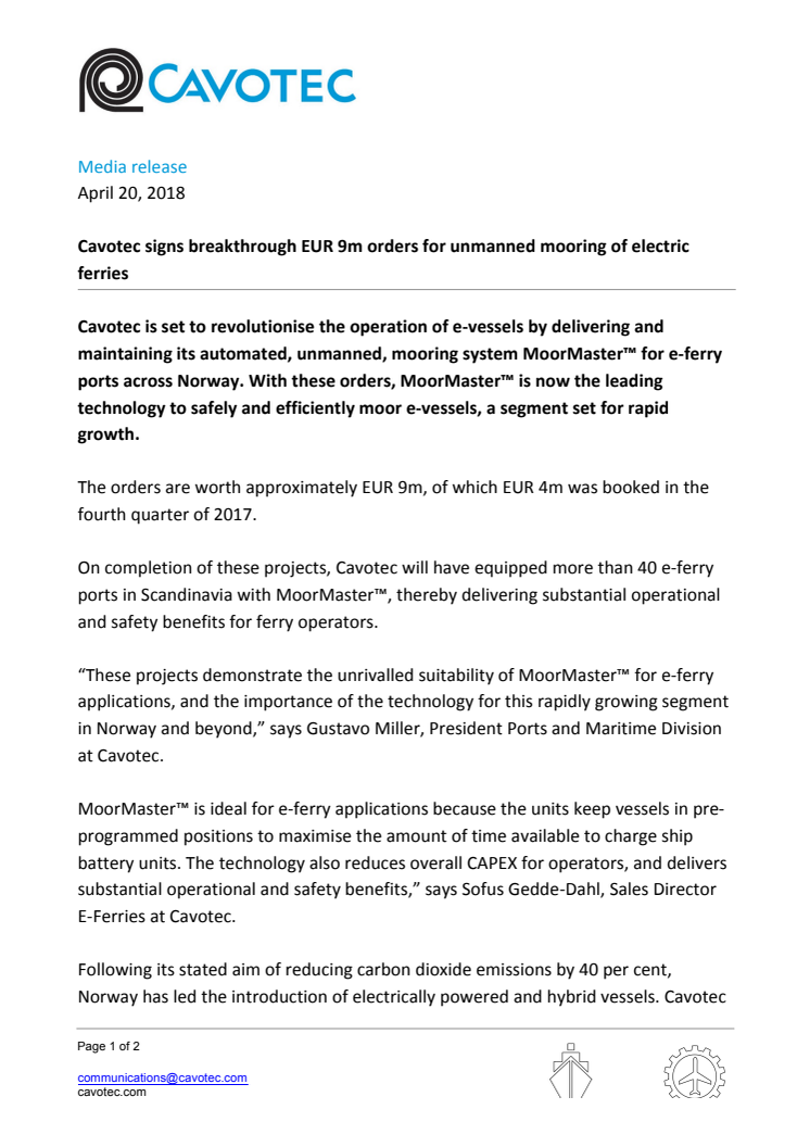 Cavotec signs breakthrough EUR 9m orders for unmanned mooring of electric ferries