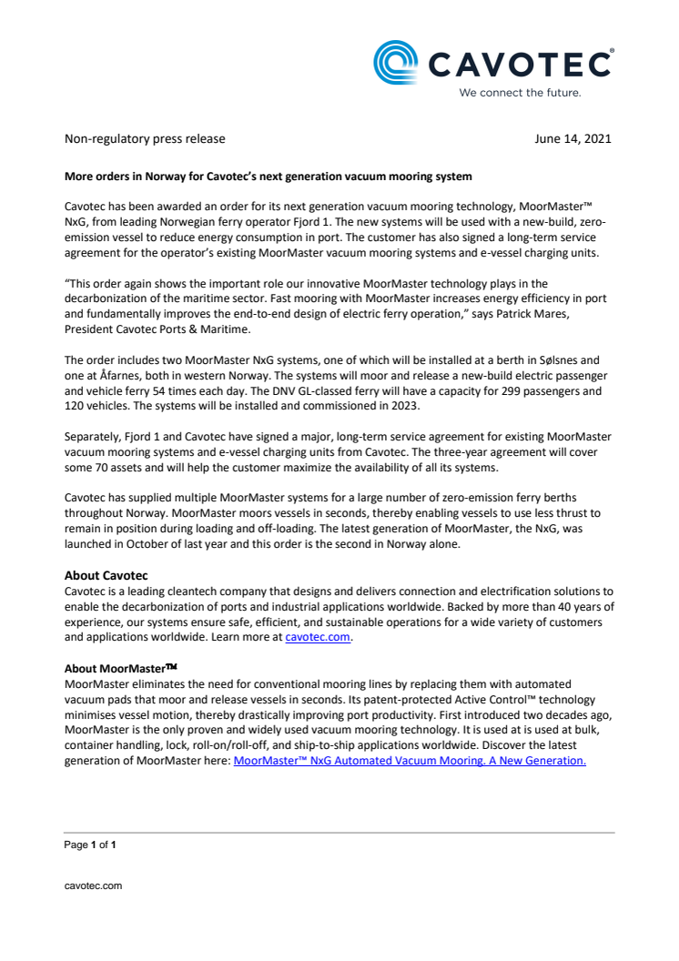 Cavotec has been awarded an order for its next generation vacuum mooring technology, MoorMaster™ NxG, from leading Norwegian ferry operator Fjord 1. The systems will be used with a new-build, zero-emission vessel to reduce energy consumption in port. The customer has also signed a long-term service agreement for the operator’s existing MoorMaster vacuum mooring systems and e-vessel charging units.