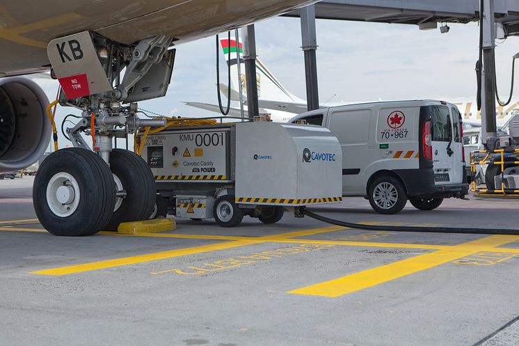 A Cavotec caddy services an aircraft at Frankfurt Airport