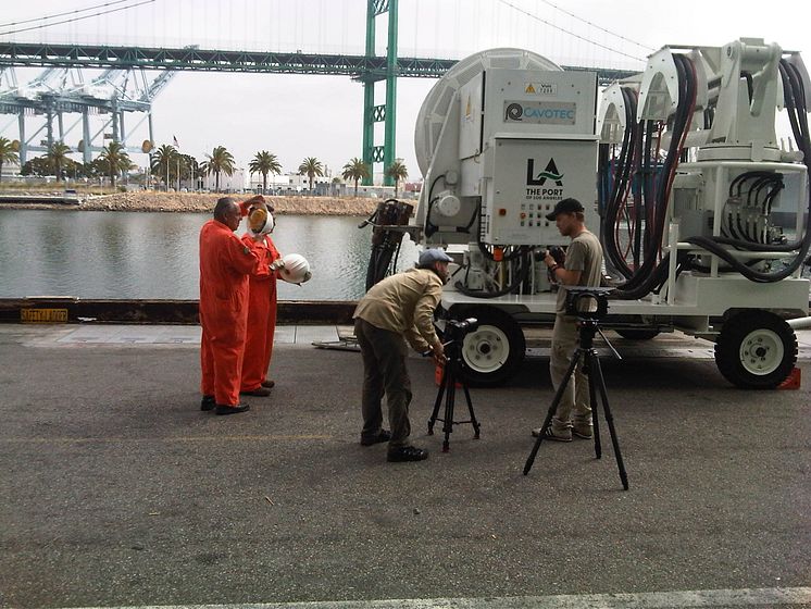 Mårten Ivert and Oskar Willers discuss filming tactics beside a Cavotec AMP Mobile unit at the Port of Los Angeles, May 28, 2011.
