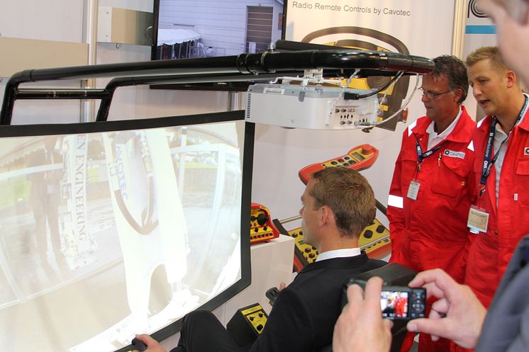 Norway's Minister of Petroleum and Energy, Ola Borten Moe, operates an excavator using a Cavotec radio remote control video link system at ONS 2012