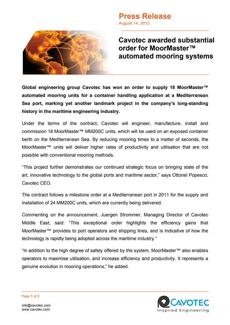 Global engineering group Cavotec has won an order to supply 18 MoorMaster™ automated mooring units for a container handling application at a Mediterranean Sea port, marking yet another landmark project in the company's long-standing history in the maritime engineering industry.