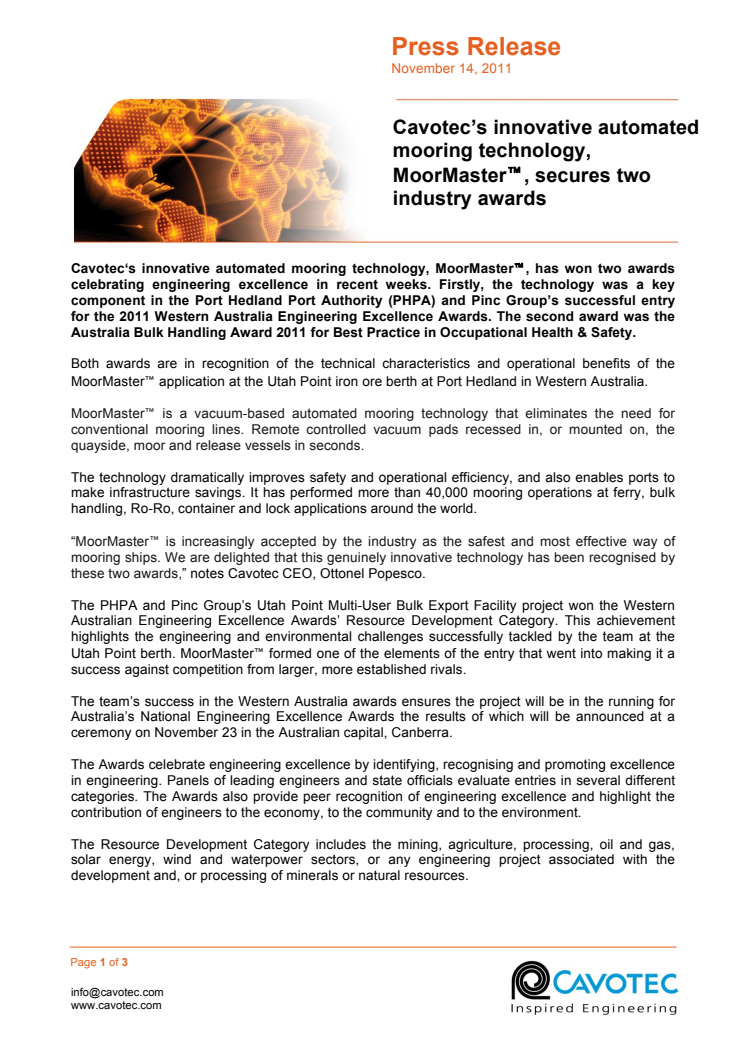 Cavotec‘s innovative automated mooring technology, MoorMaster™, has won two awards celebrating engineering excellence in recent weeks. Firstly, the technology was a key component in the Port Hedland Port Authority (PHPA) and Pinc Group’s successful entry for the 2011 Western Australia Engineering Excellence Awards. The second award was the Australia Bulk Handling Award 2011 for Best Practice in Occupational Health & Safety.